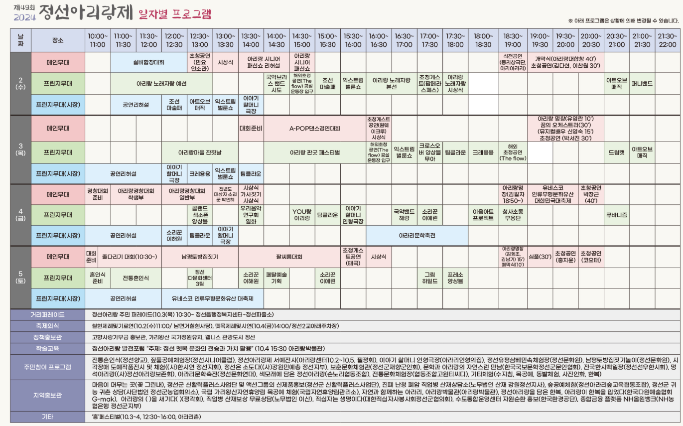 - 장소: 정선공설운동장, 정선아리랑시장, 정선아라리촌 일원